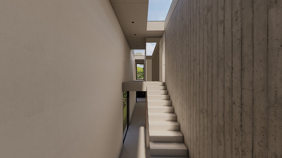 Os materiais reforçam seu caráter contemporâneo: concreto aparente, vidro e muros escuros em contraste com o interior iluminado; microcimento nos banheiros, porcelanatos Portobello, esquadrias de alumínio preto e porta principal em ACM. Claraboias estrategicamente posicionadas na escada e no corredor superior completam a iluminação natural e acentuam a expressividade do concreto.