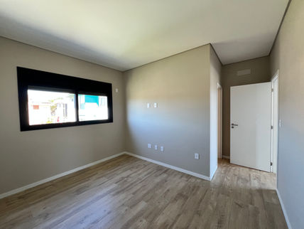 No térreo, uma suíte garante acessibilidade; no pavimento superior, há outras três suítes, incluindo a máster, com closet, varanda e um banheiro com cuba dupla e dois chuveiros.